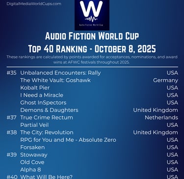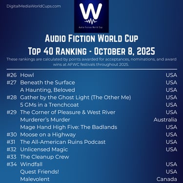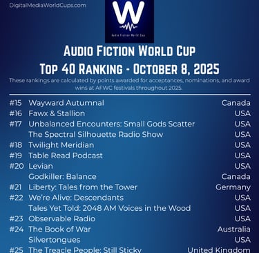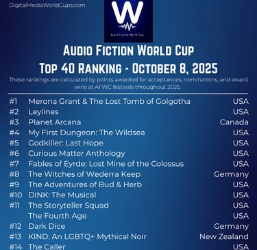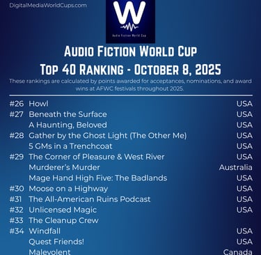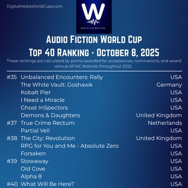 When a project is accepted to a festival, nominated for an award at a festival, and wins an award at a festival, that project will receive points on the Audio Fiction World Cup. Throughout the year we will publish the rankings as more festivals report their various stages. At the end of the year we will publish the final ranking for 2024 based on the decisions from the juries at each of these festivals.